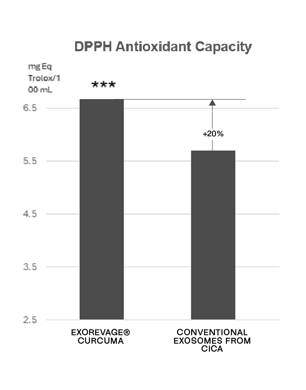 EXOREVAGE® CICA was evaluated against conventional plant- based exosomes from Centella asiatica (CICA) in antioxidant capacity test using DPPH quantifying the mg Equivalent Trolox/ 100mL. It’s found up to 20% higher antioxidant capacity in EXOREVAGE® CICA compared to conventional CICA exosomes.