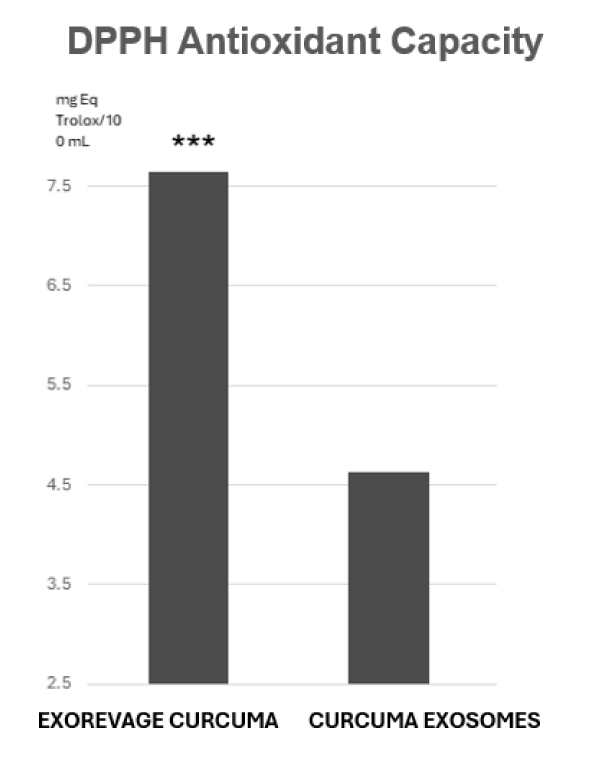 EXOREVAGE® CURCUMA was evaluated against conventional plant- based exosomes from curcuma longa in antioxidant capacity test using DPPH quantifying the mg Equivalent Trolox/ 100mL. It’s found up to 67% higher antioxidant capacity in EXOREVAGE CURCUMA compared to conventional CURCUMA exosomes.